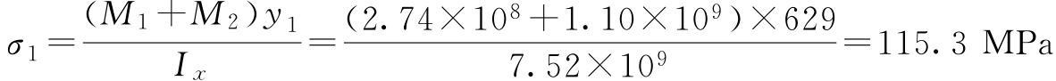 主梁截面几何参数:Ix=7.52×109mm4;y1=629mm;y2=545mm;Iy=1.62×109mm4;x1=299mm;x2=277mm。